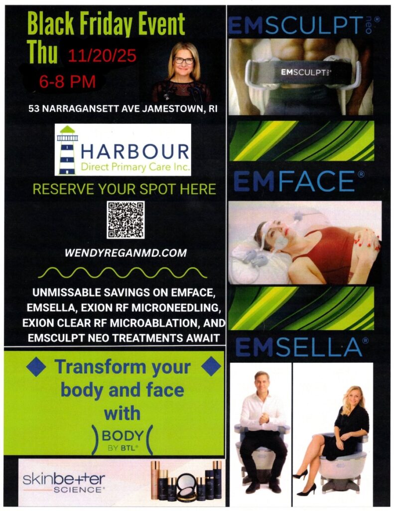 Join us from 5–7 PM at 53 Narragansett Ave, Jamestown, RI for unmissable savings on Emsella, Exion RF Microneedling, Exion Clear RF Microblasion, and Emsculpt Neo treatments. A great time to see why our most-loved technologies are patient favorites.